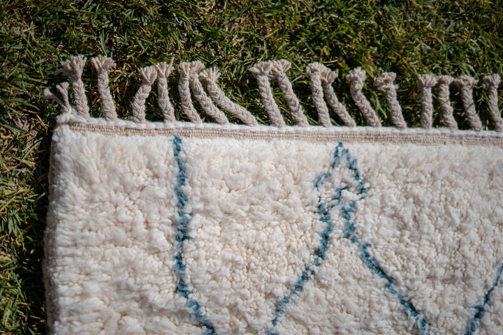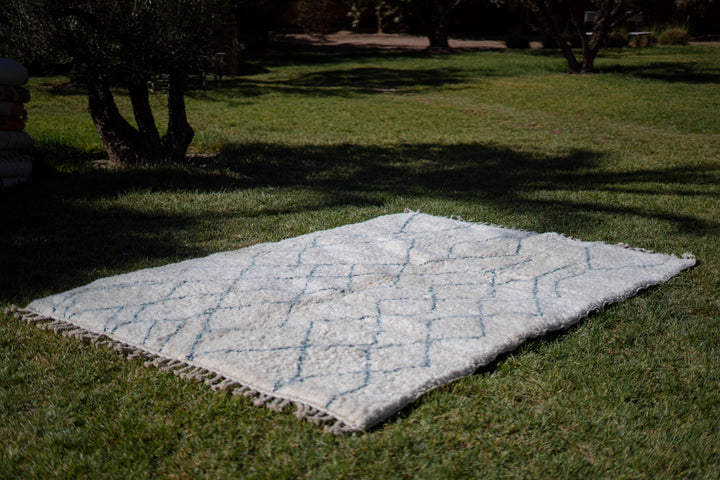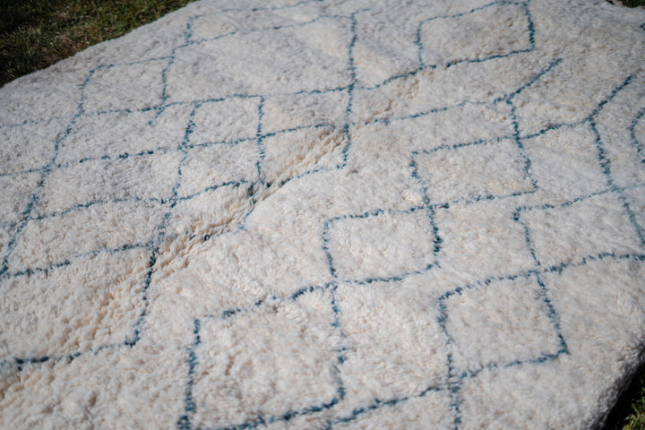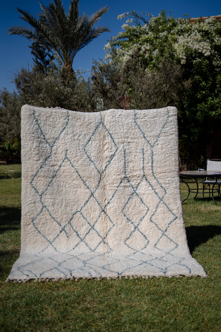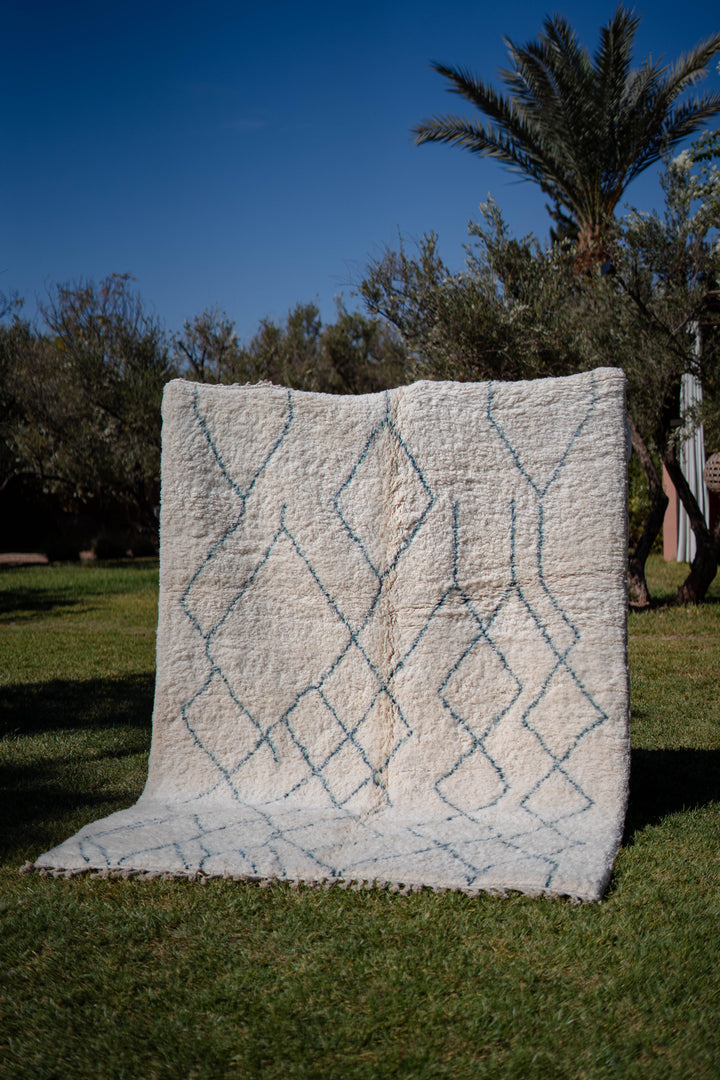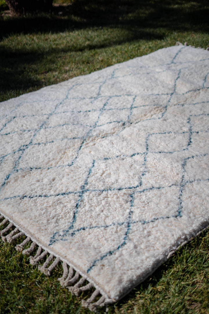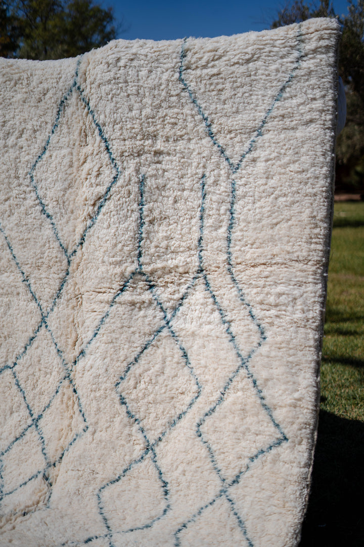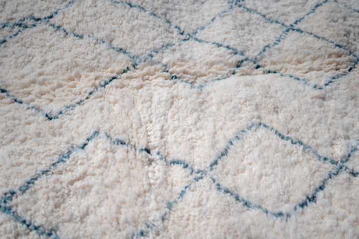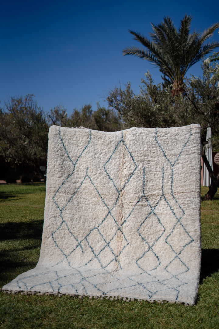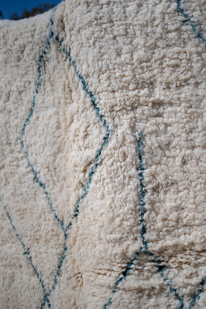 "ARCTIQUE" est un tapis en laine épaisse, tissé à la main dans le moyen Atlas au Maroc. Cette pièce unique est 100% laine. Avec son ton blanc cassé, bleu polaire et ces formes géométriques et graphiques, ce tapis apportera une touche chaleureuse, tendance et moderne a votre intérieur.