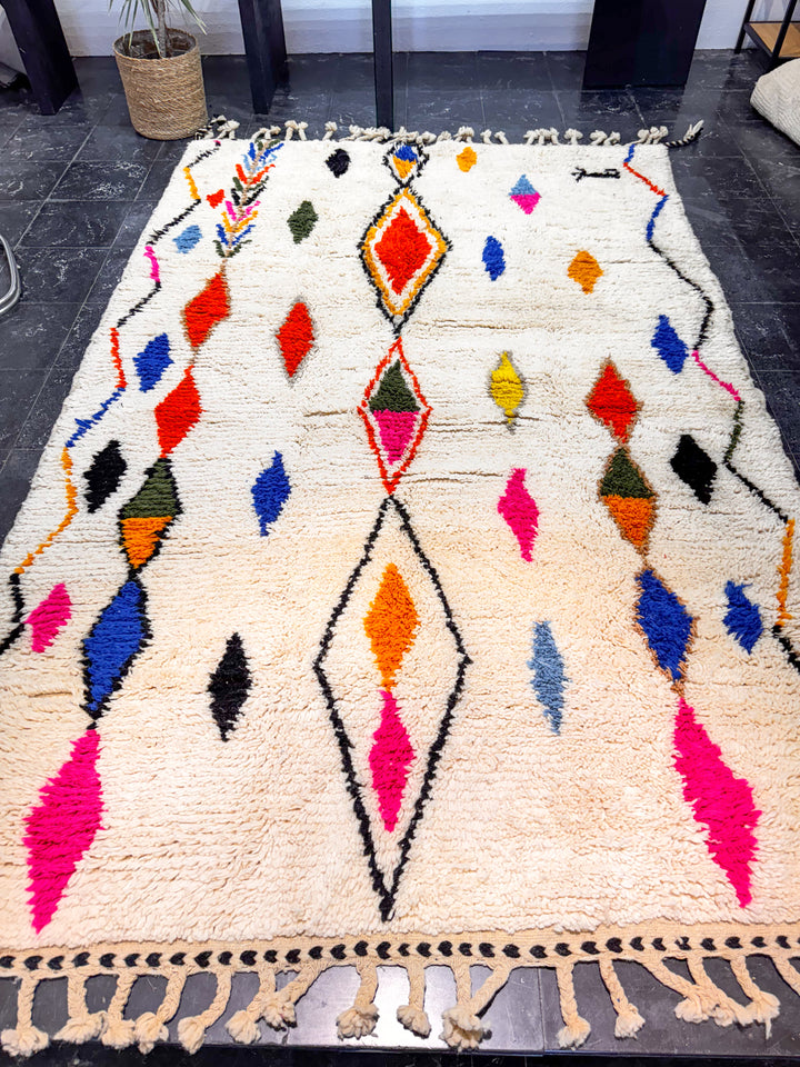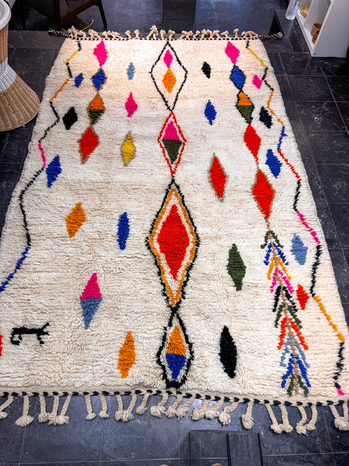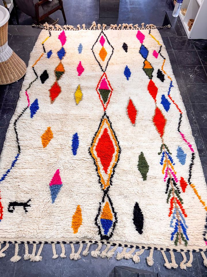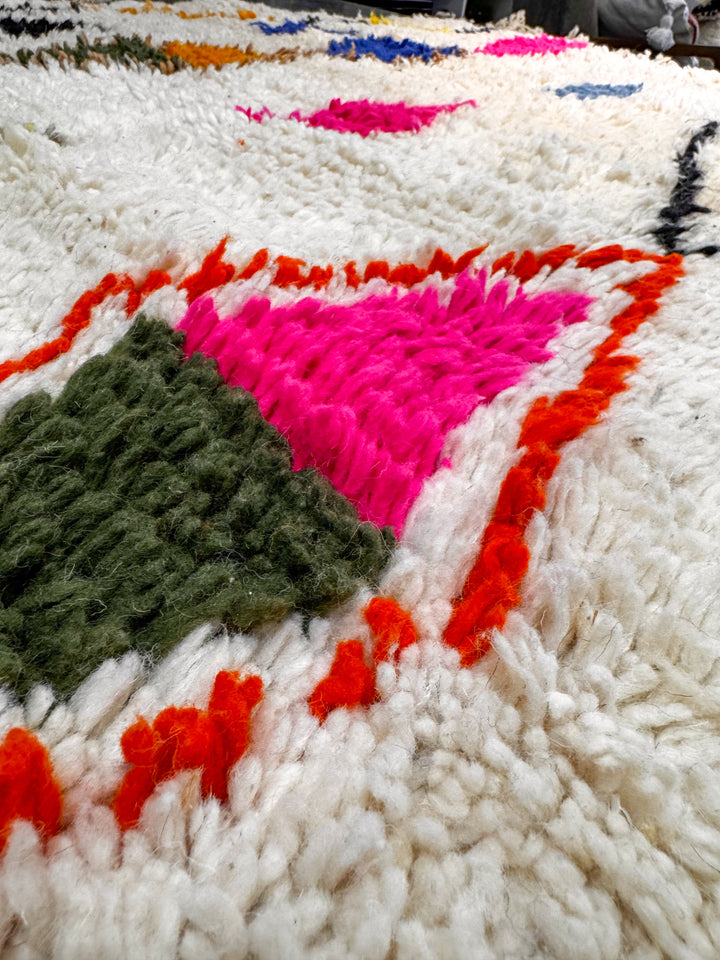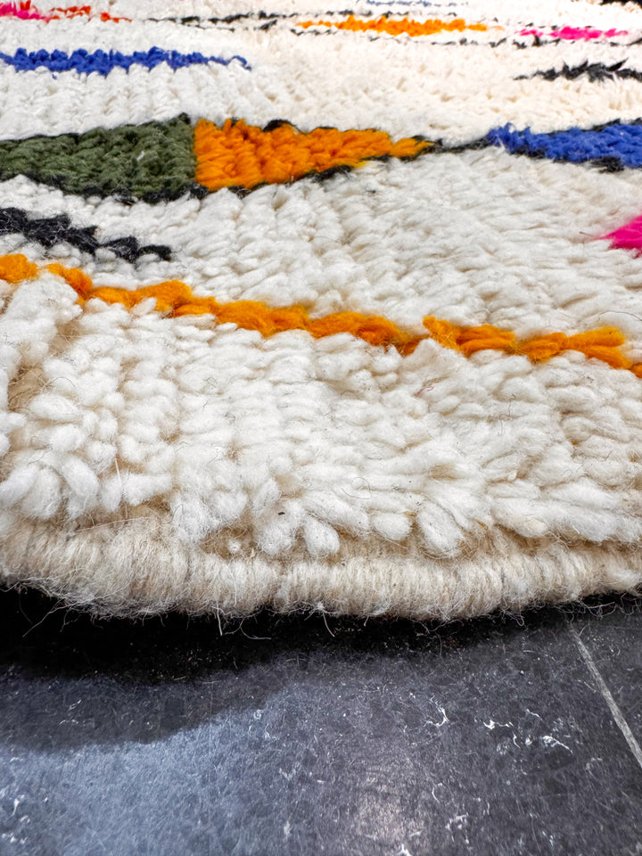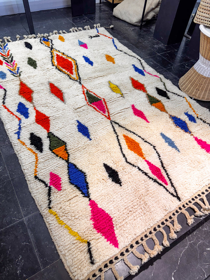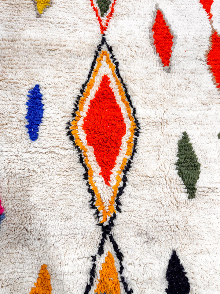 "ARLEQUIN" est un tapis d'exception originaire du cœur de l'Atlas marocain. Tissé à la main en pure laine, il arbore une teinte blanc crème rehaussée de motifs berbères multicolores.