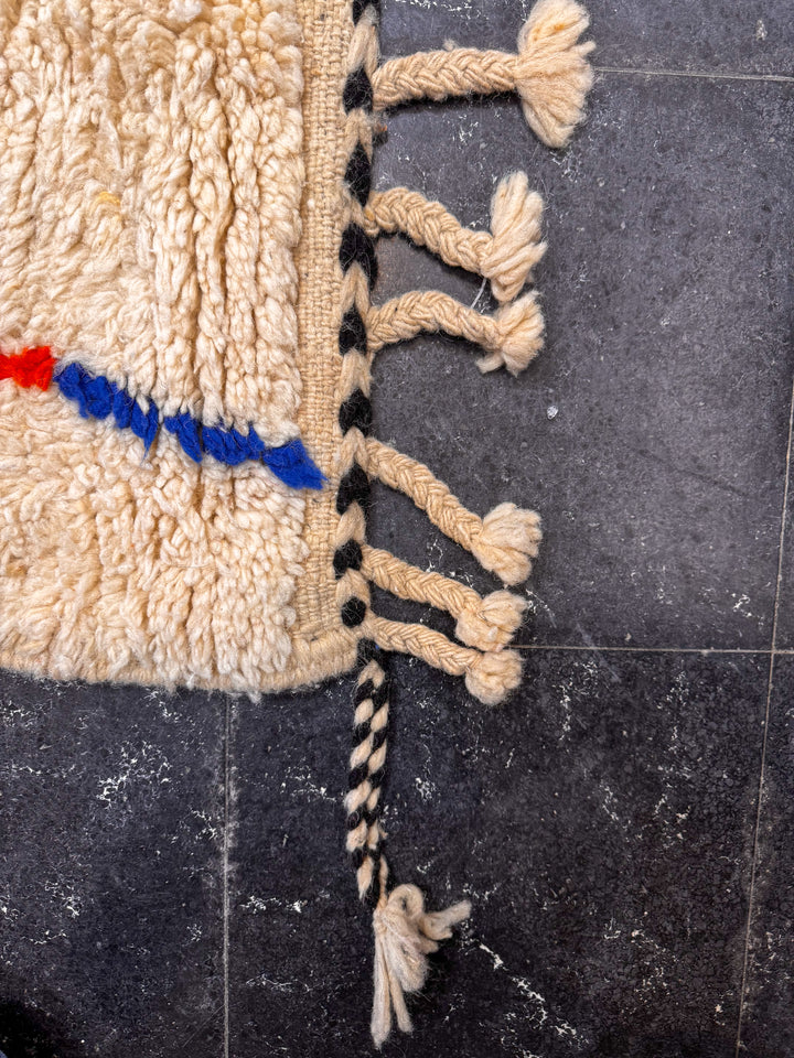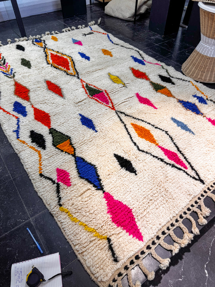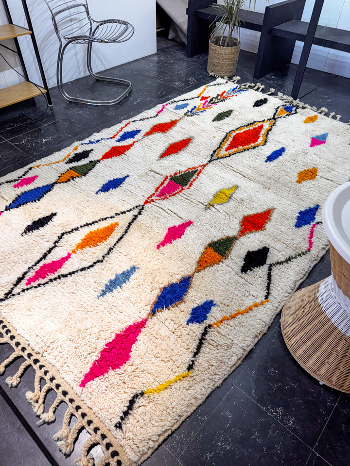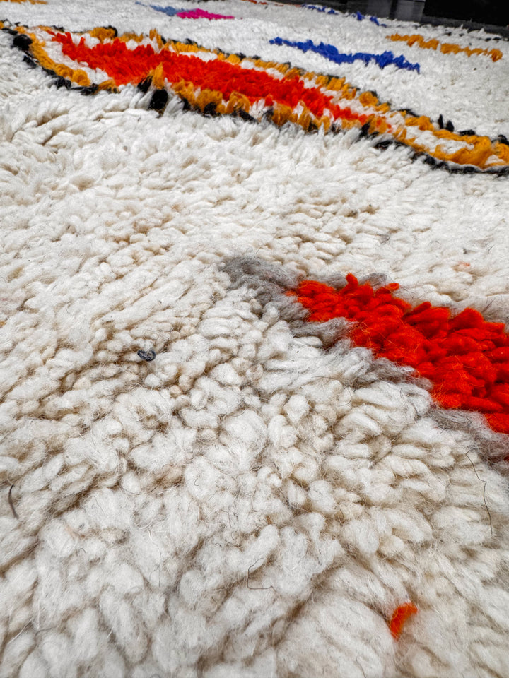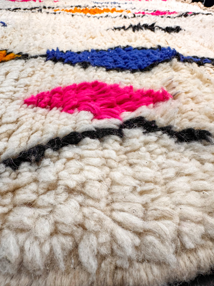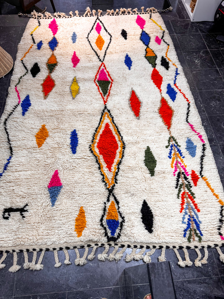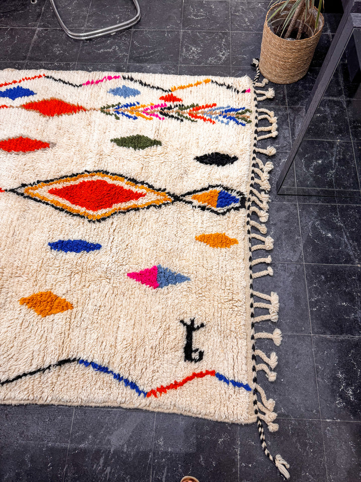 "ARLEQUIN" est un tapis d'exception originaire du cœur de l'Atlas marocain. Tissé à la main en pure laine, il arbore une teinte blanc crème rehaussée de motifs berbères multicolores.