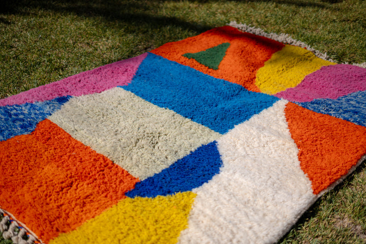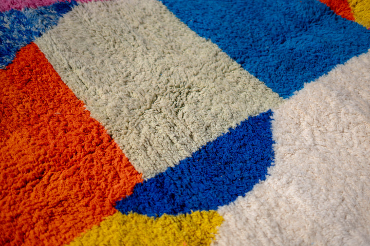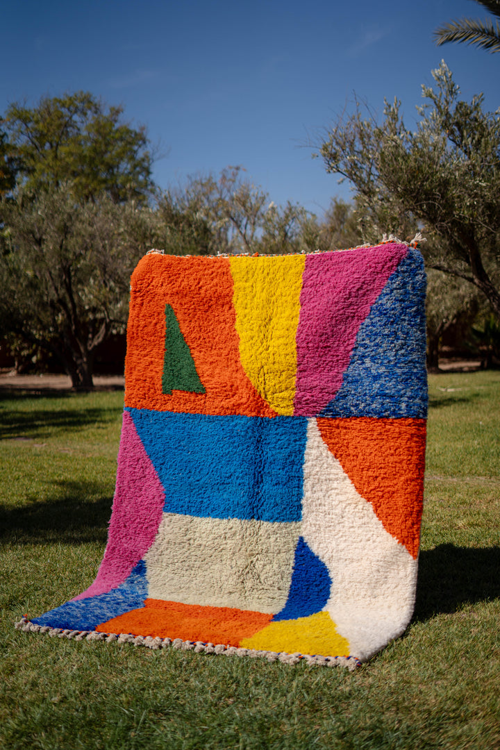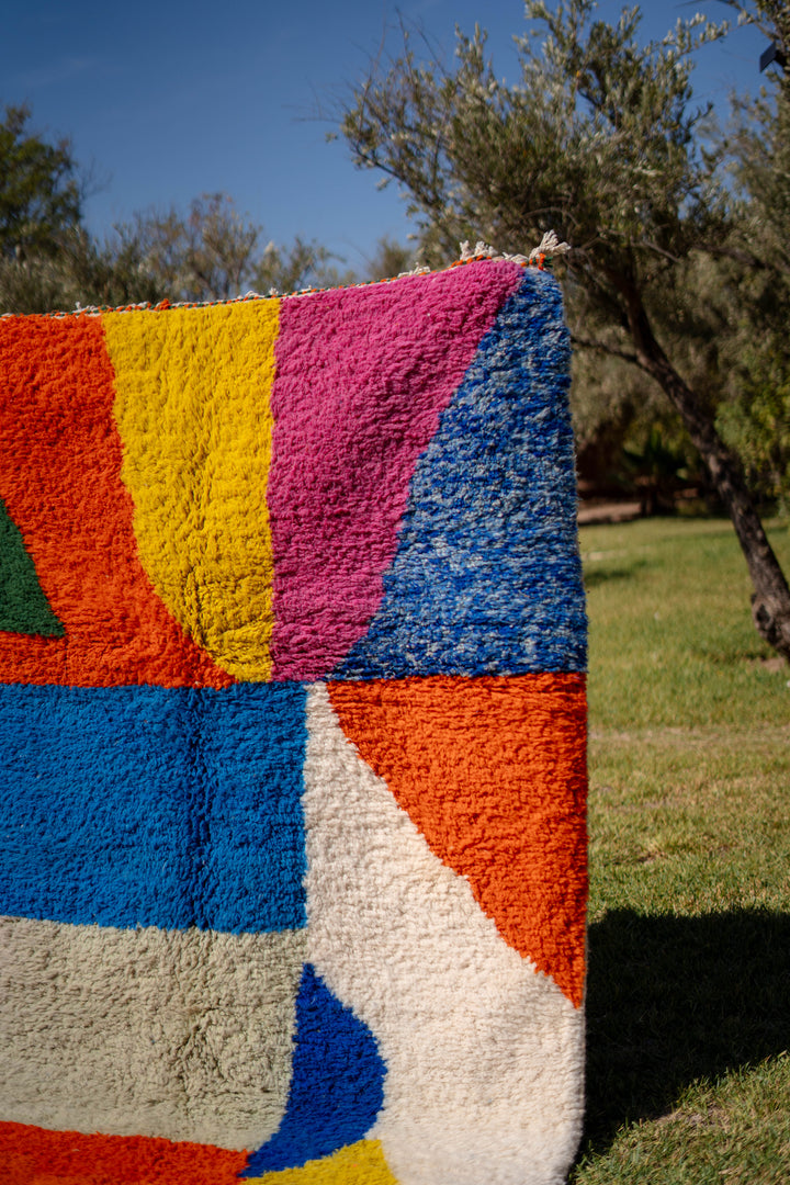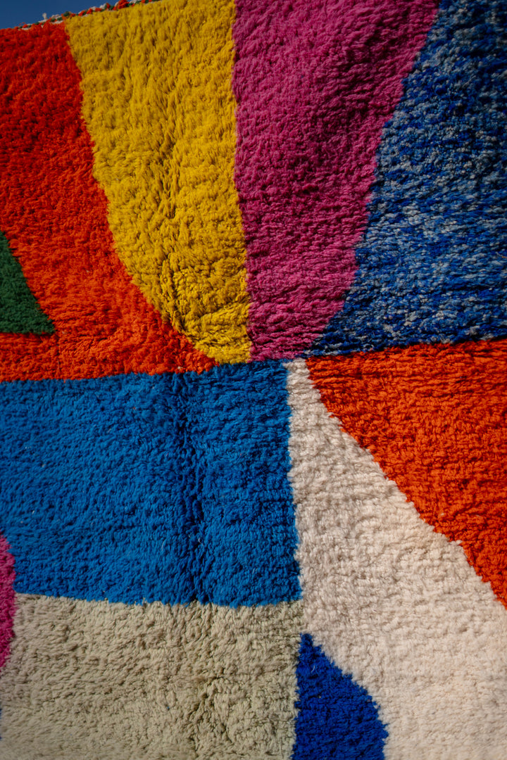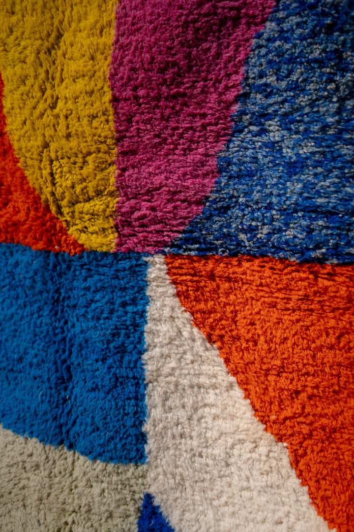 "ARTY" est un tapis d'exception originaire du cœur de l'Atlas marocain. Tissé à la main en pure laine, il arbore une teinte blanc crème rehaussée de motifs multicolores.