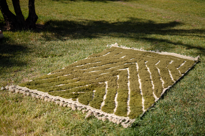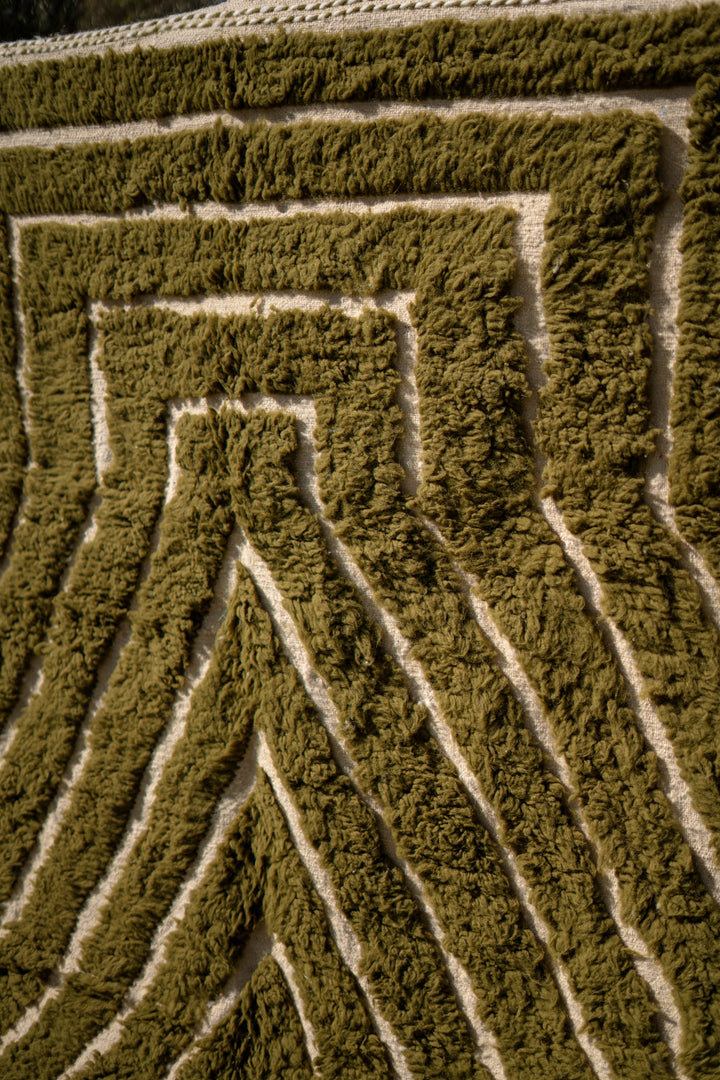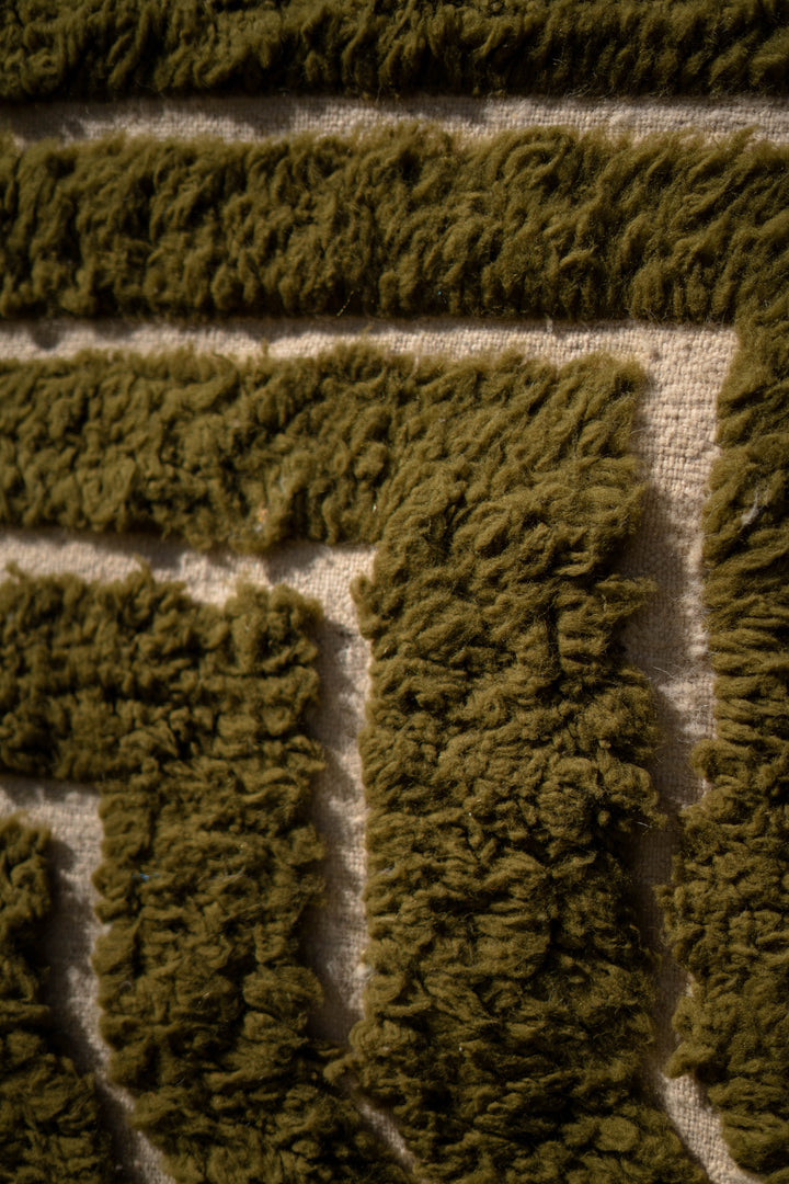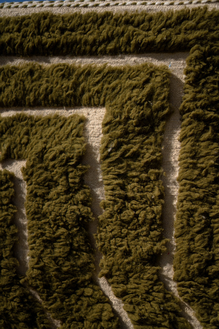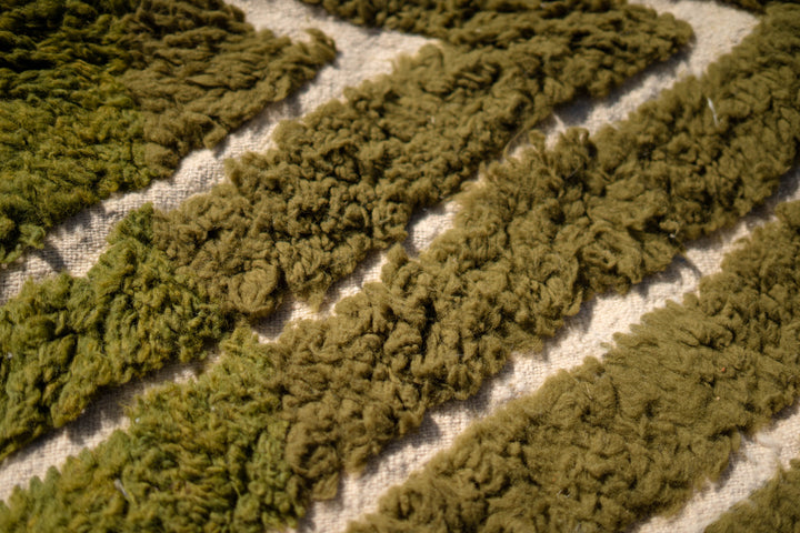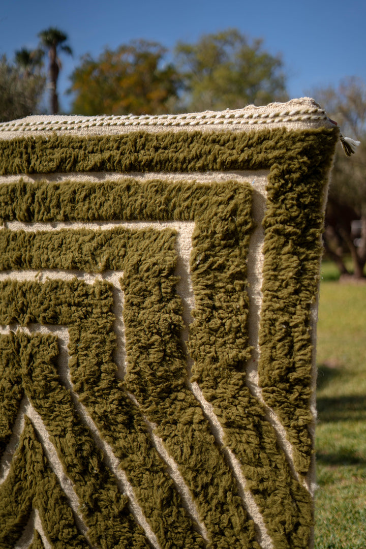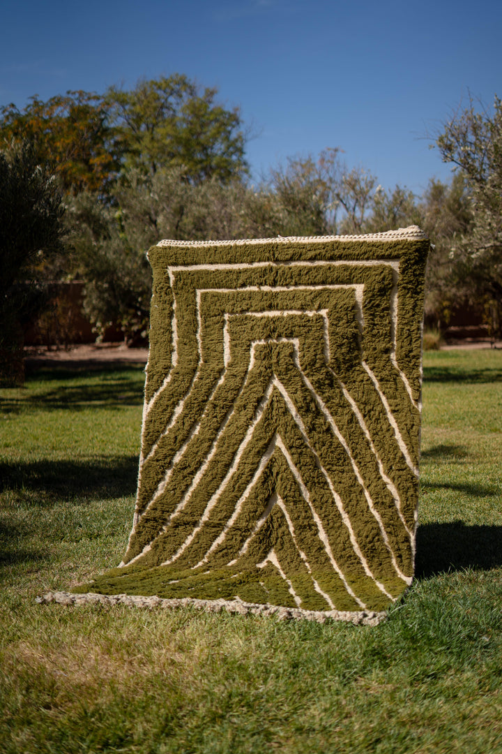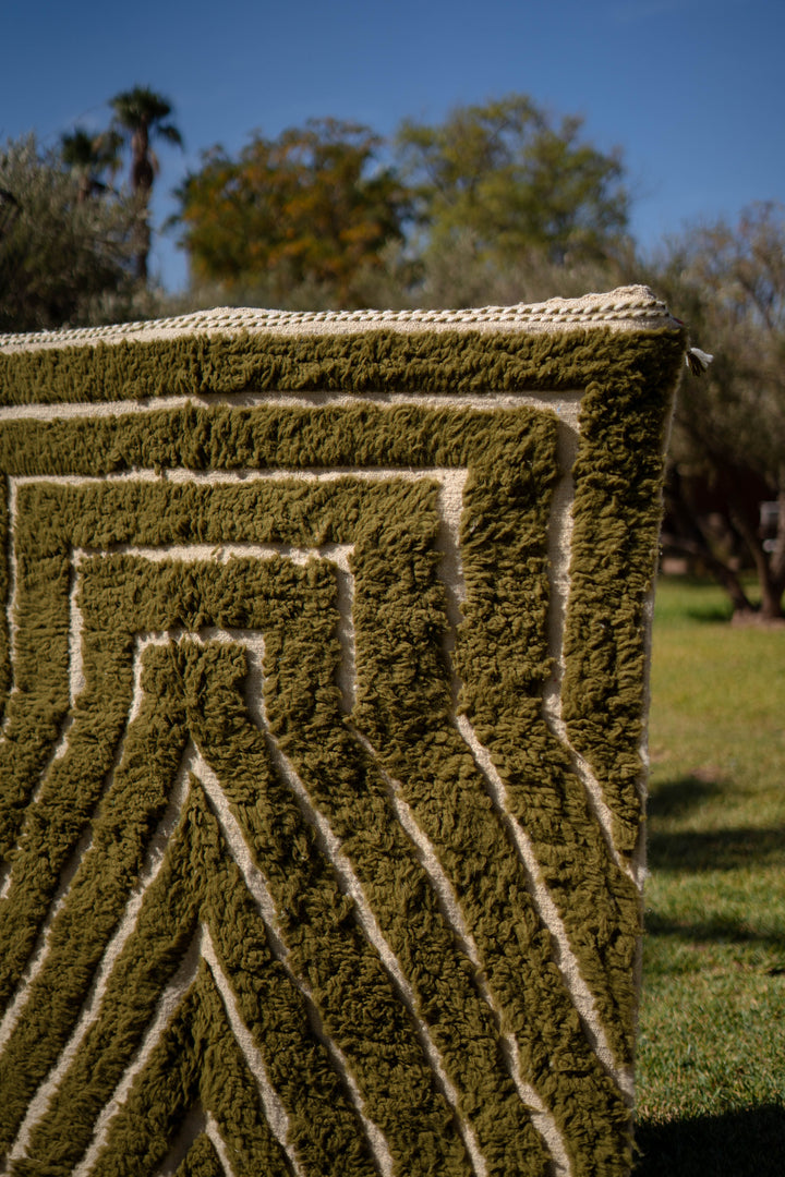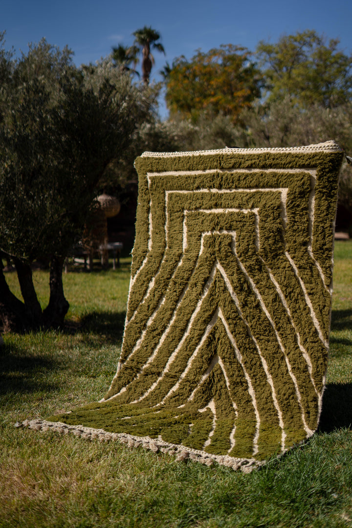 "KAKI" est un tapis en laine épaisse, tissé à la main dans la région de l’Ourika dans le moyen Atlas au Maroc. Cette pièce unique est 100% laine. Avec ses tons Kaki, Blancs Cassés et ces formes géométriques ce tapis apportera une touche chaleureuse, tendance et moderne a votre intérieur.