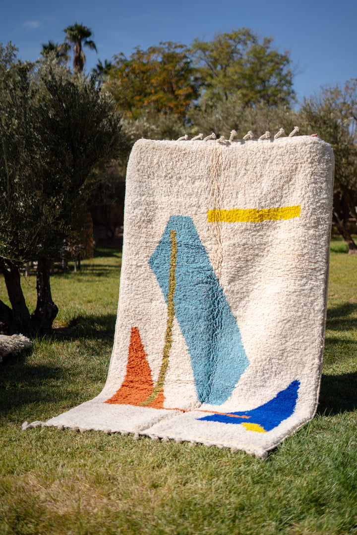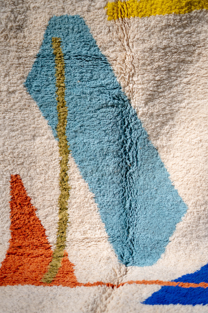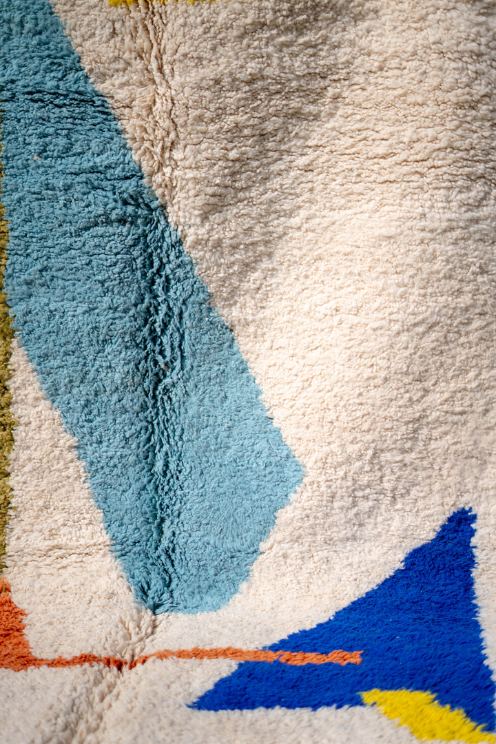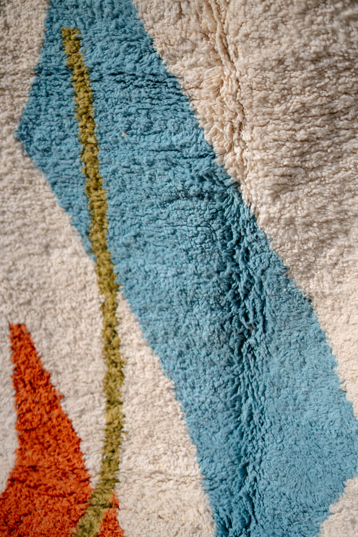 "ASILAH" est un tapis en laine épaisse, tissé à la main dans la région de l’Ourika dans le moyen Atlas au Maroc. Cette pièce unique est 100% laine. Avec ses tons Blancs Cassés, multicolores et ces formes géométriques ce tapis apportera une touche chaleureuse, tendance et moderne a votre intérieur.