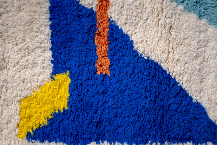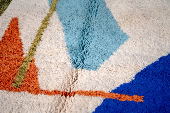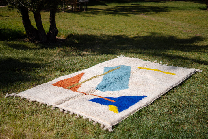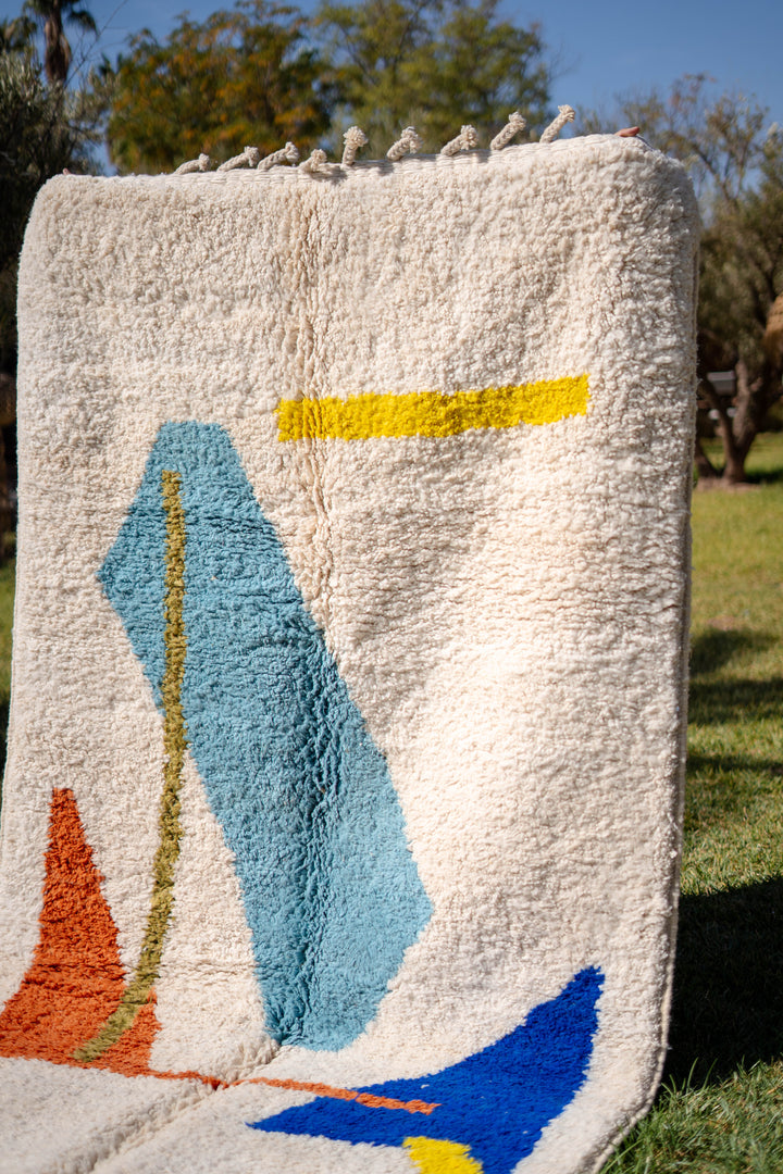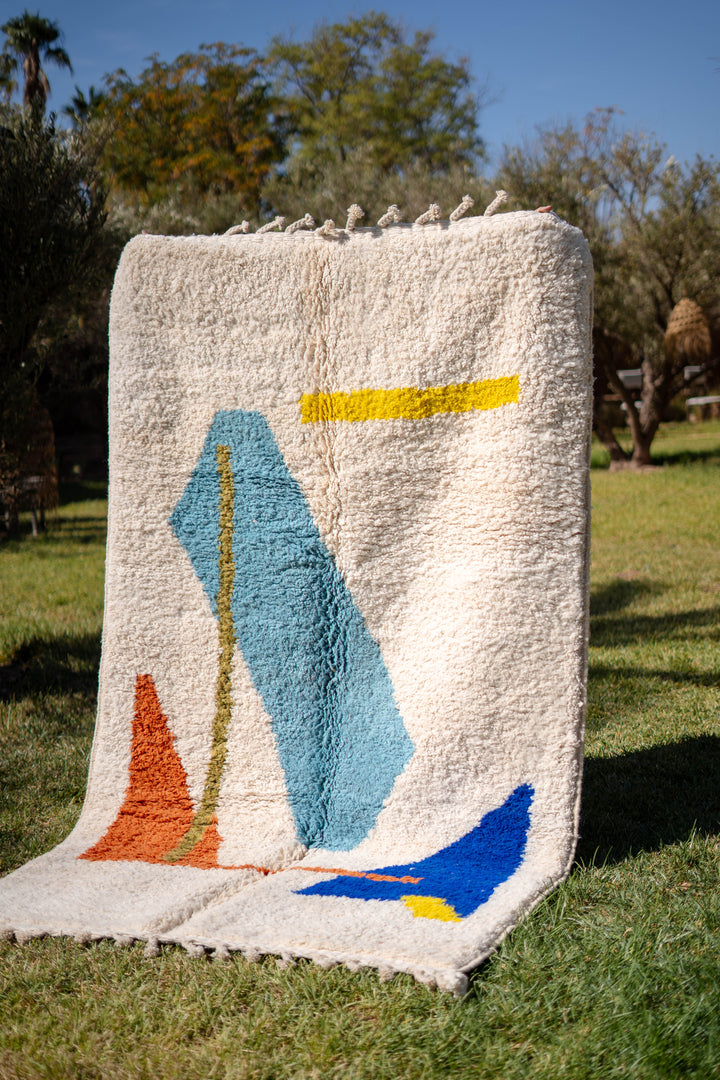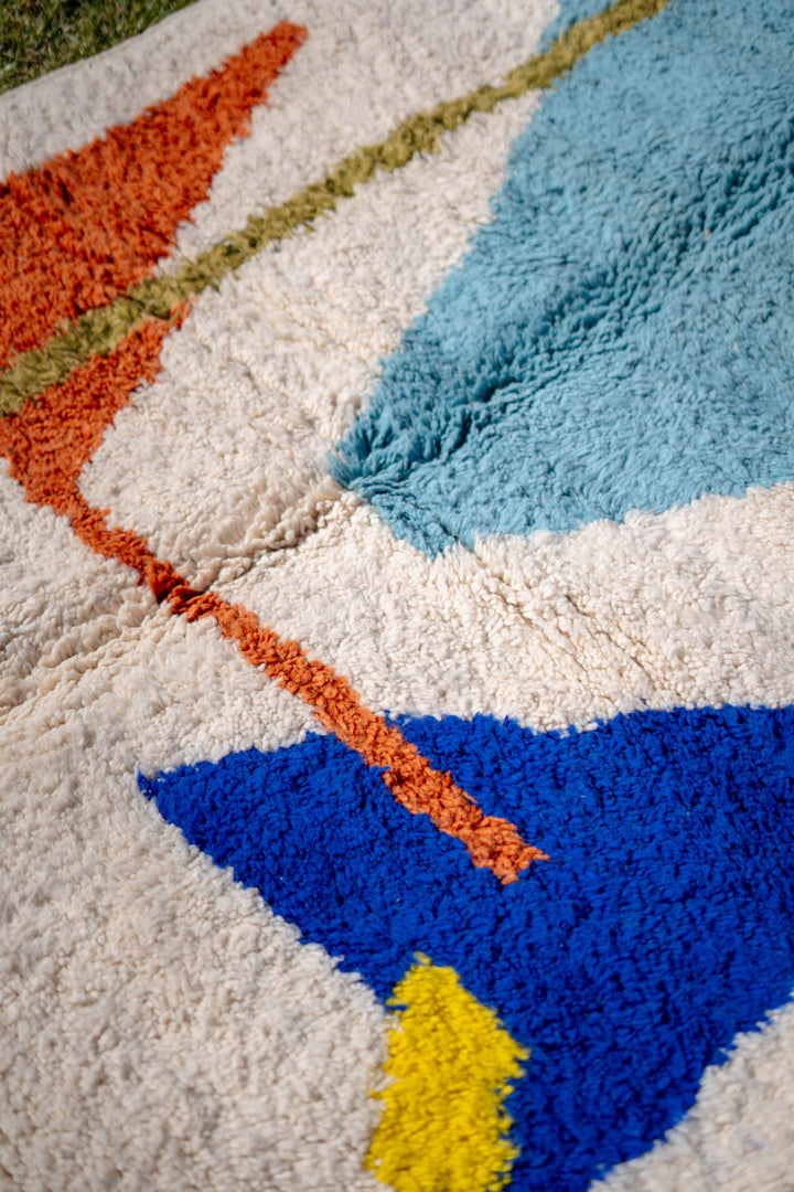 "ASILAH" est un tapis en laine épaisse, tissé à la main dans la région de l’Ourika dans le moyen Atlas au Maroc. Cette pièce unique est 100% laine. Avec ses tons Blancs Cassés, multicolores et ces formes géométriques ce tapis apportera une touche chaleureuse, tendance et moderne a votre intérieur.