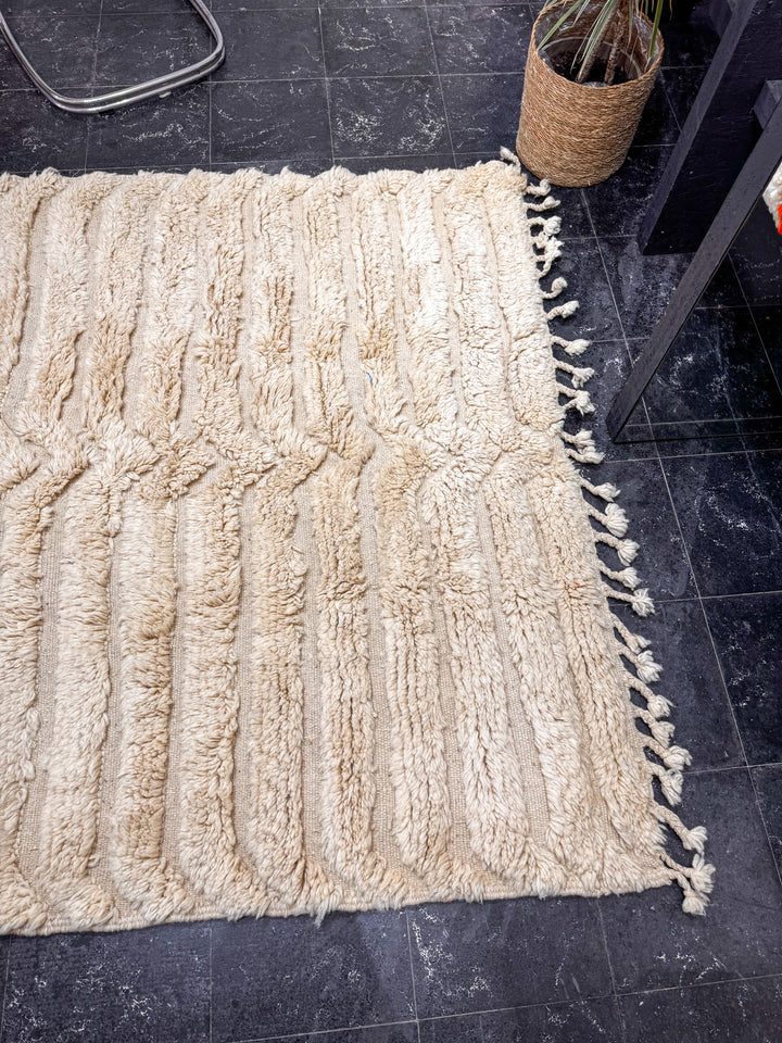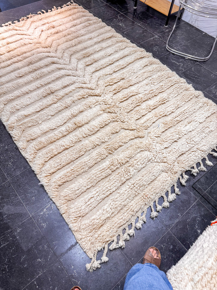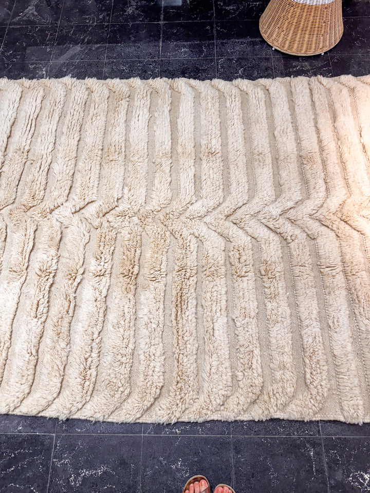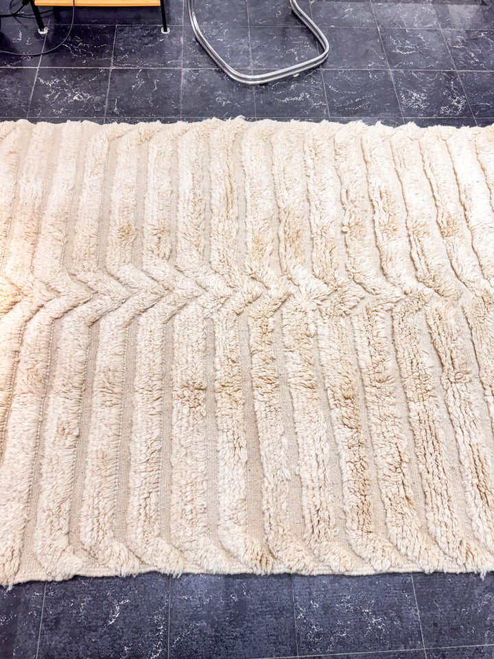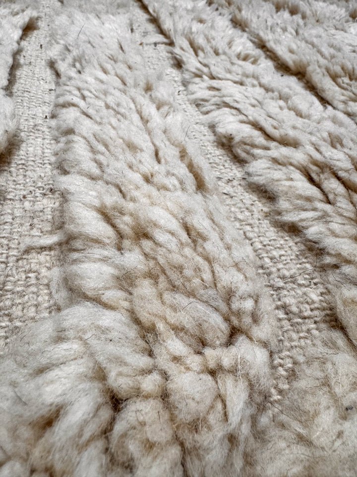 "MOUAGE" est un tapis en laine épaisse, tissé à la main dans la région de l’Ourika dans le moyen Atlas au Maroc. Cette pièce unique est 100% laine. Avec son ton blanc cassé et ces formes géométriques ce tapis apportera une touche chaleureuse, tendance et moderne a votre intérieur.