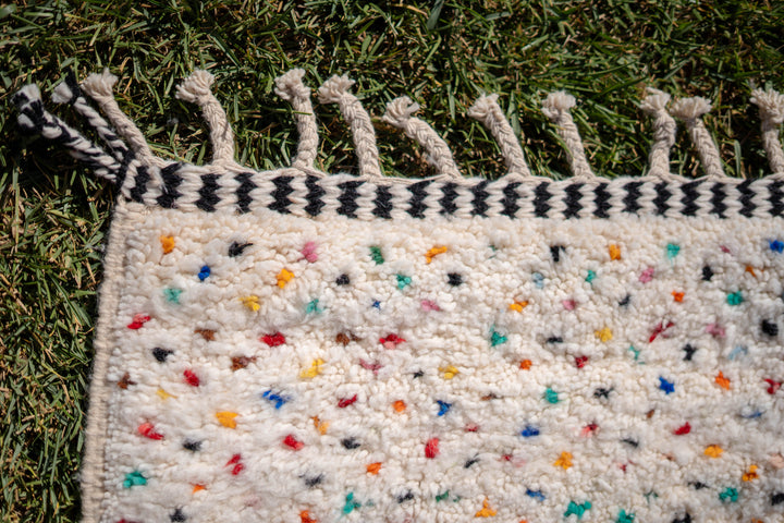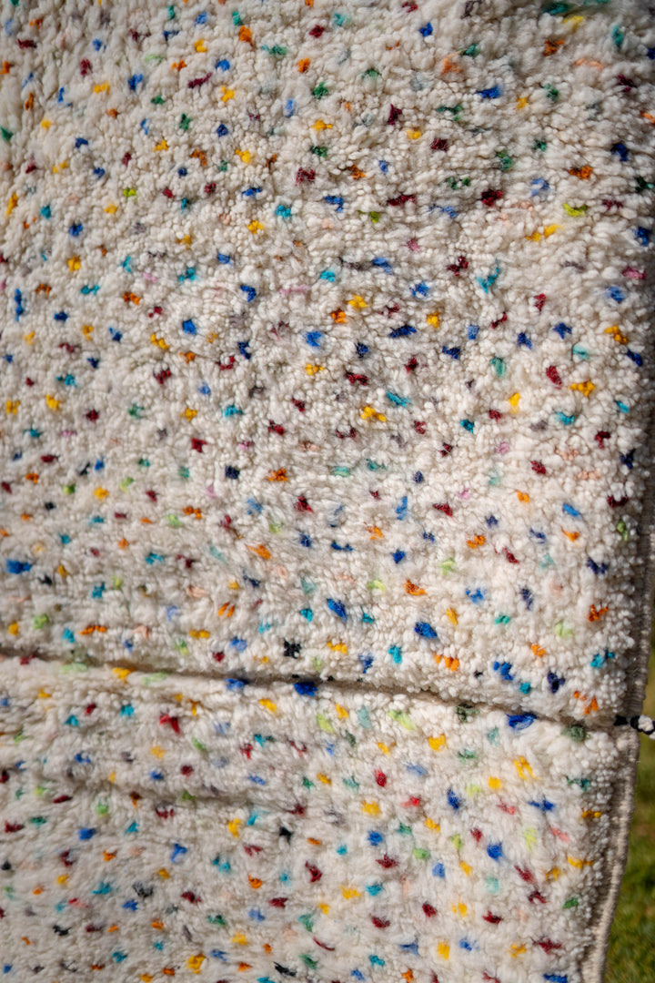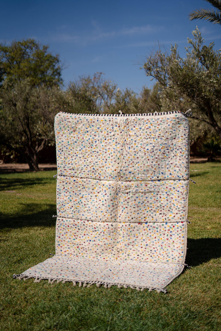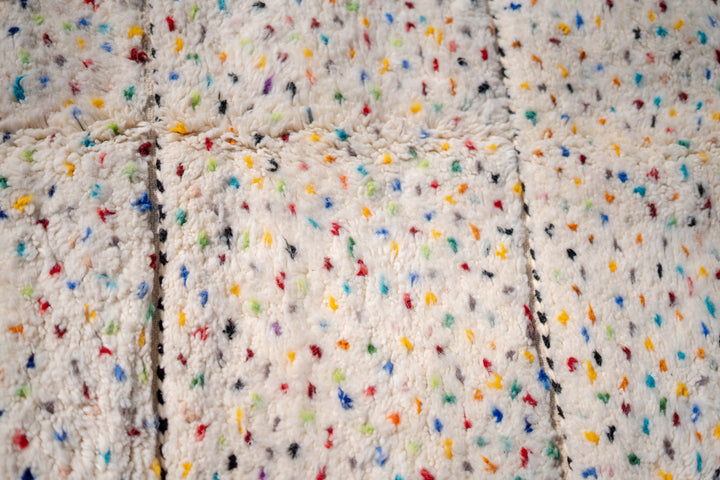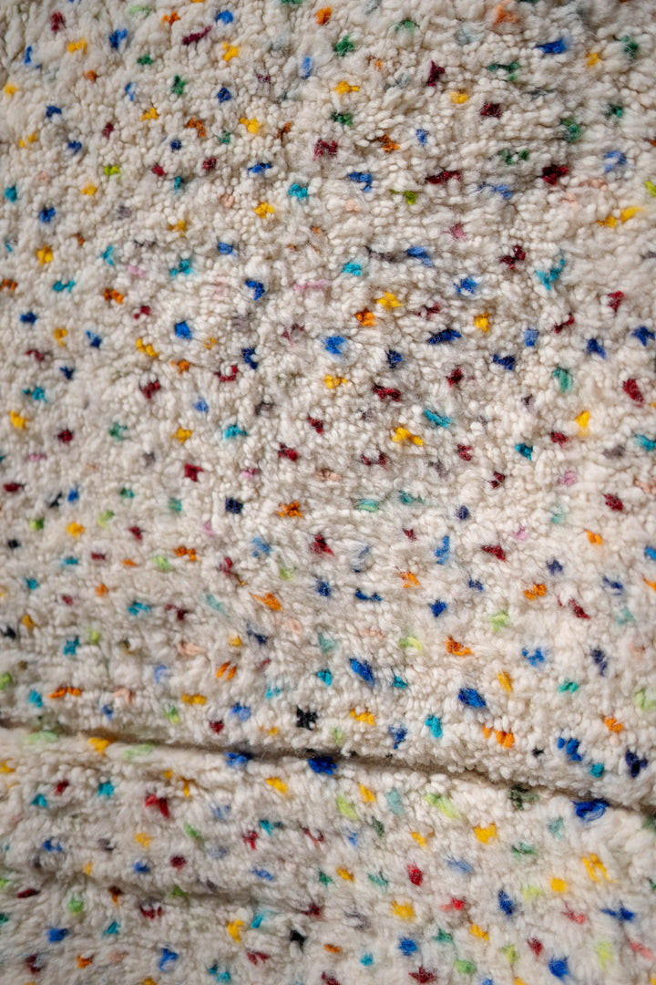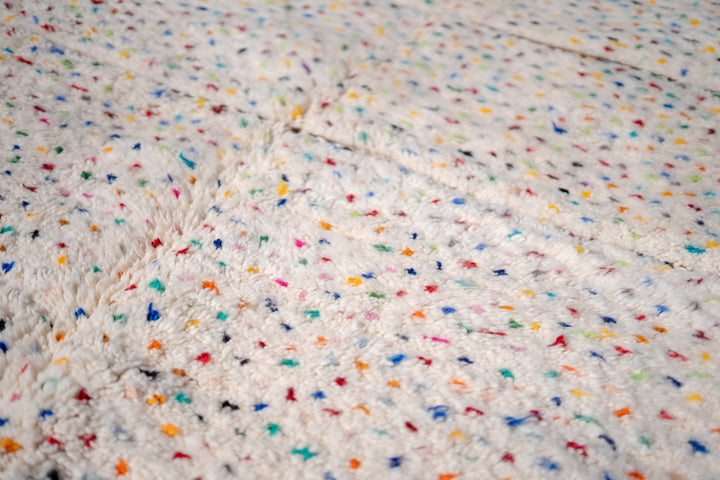 "NOUKTA" est un tapis d'exception originaire du cœur de l'Atlas marocain. Tissé à la main en pure laine, il arbore une teinte blanc crème rehaussée de motifs multicolores.