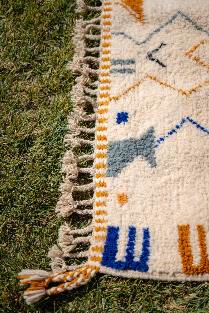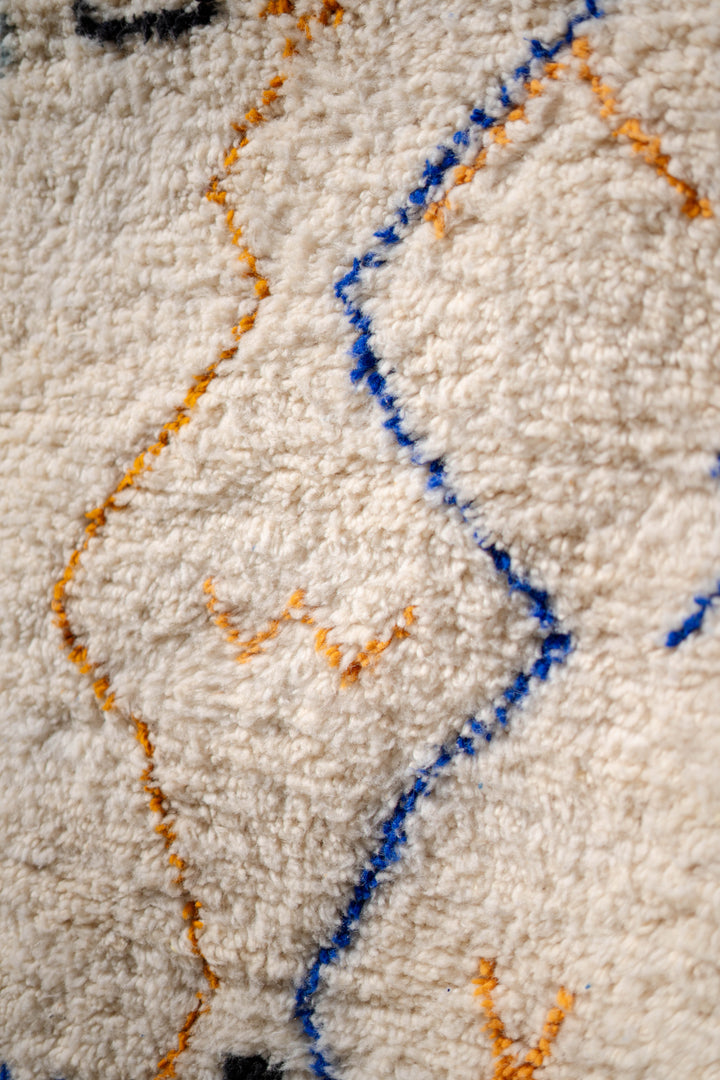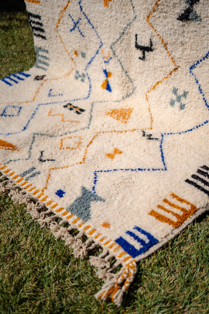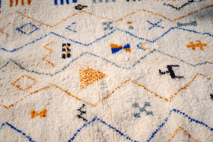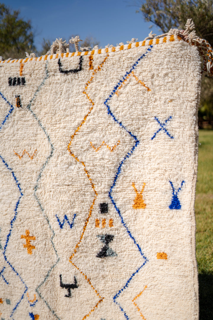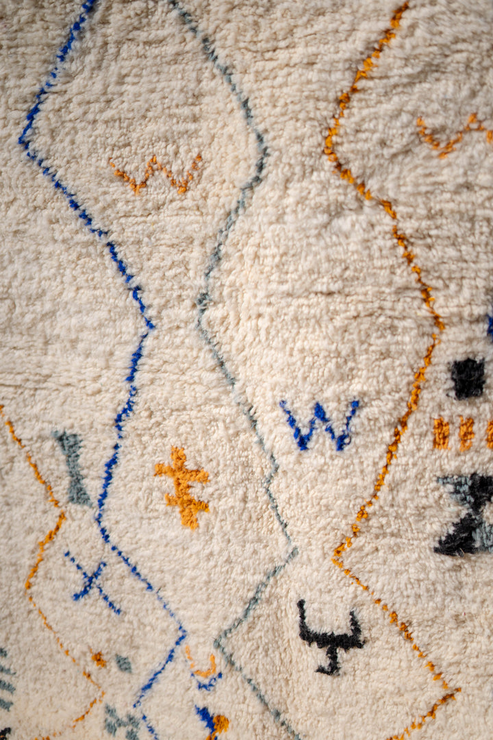 "OUZOUD" est un tapis d'exception originaire du cœur de l'Atlas marocain. Tissé à la main en pure laine, il arbore une teinte blanc crème rehaussée de motifs multicolores.