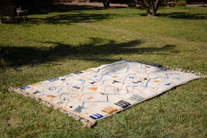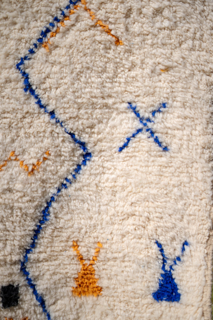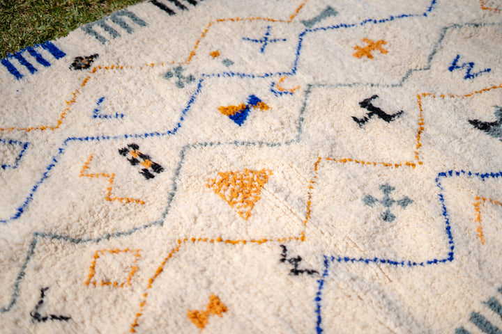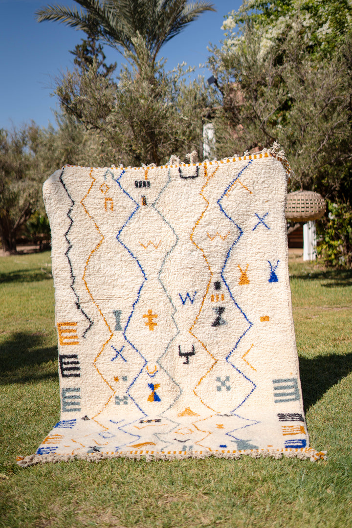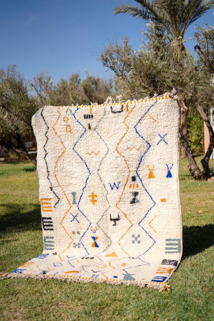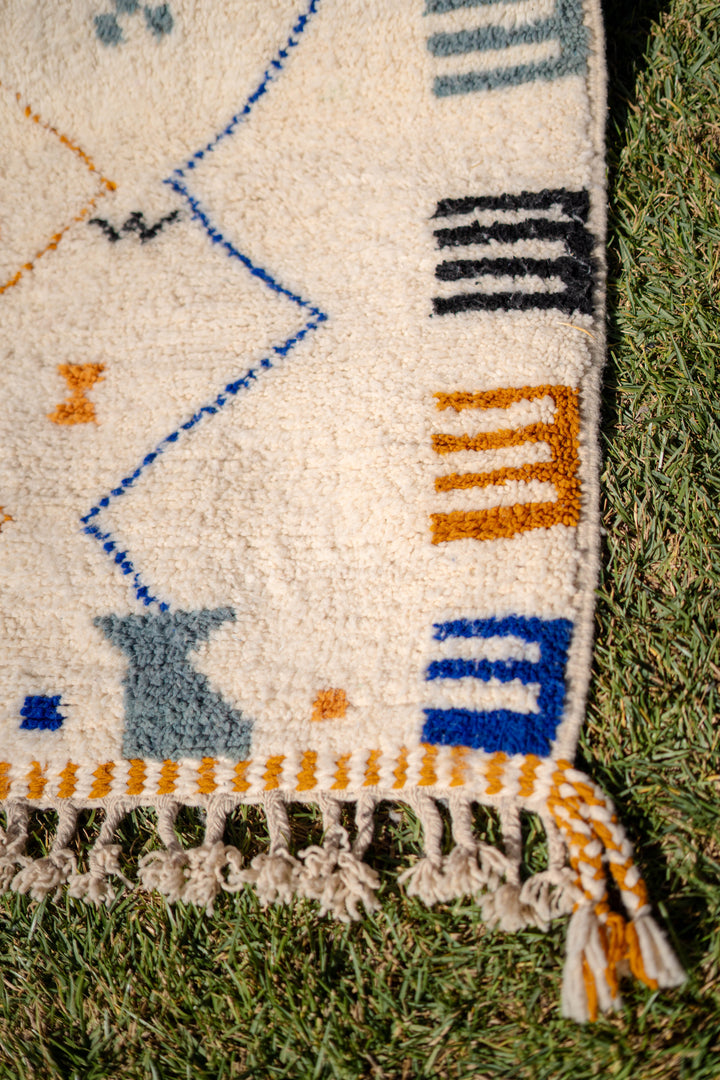 "OUZOUD" est un tapis d'exception originaire du cœur de l'Atlas marocain. Tissé à la main en pure laine, il arbore une teinte blanc crème rehaussée de motifs multicolores.