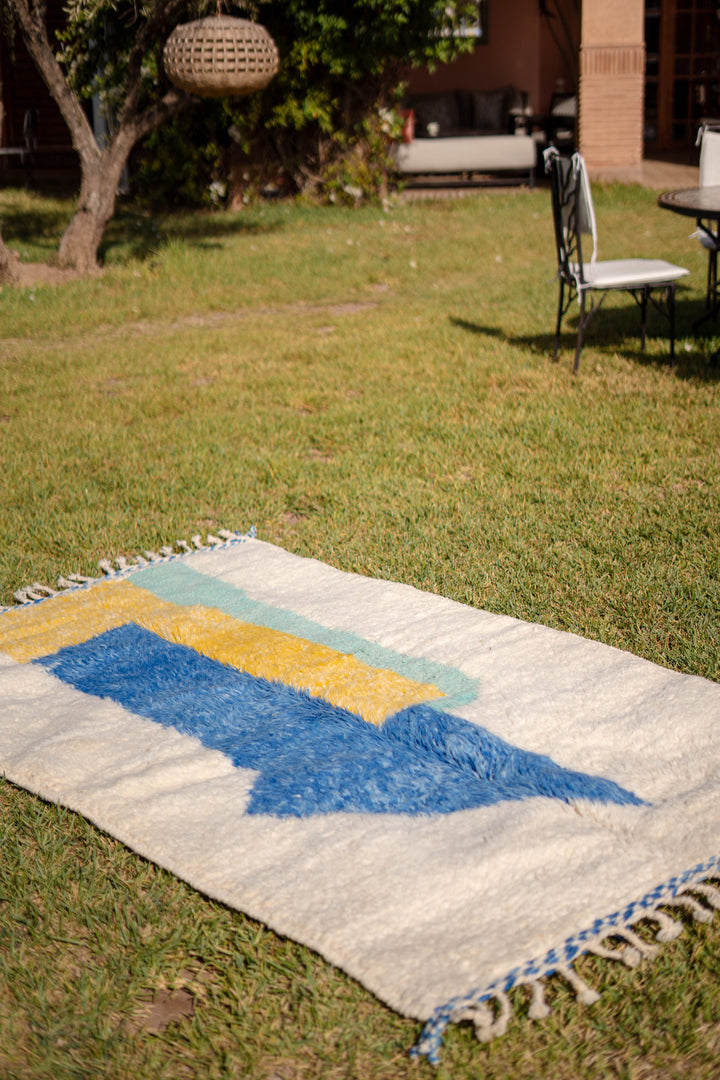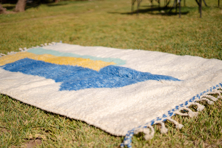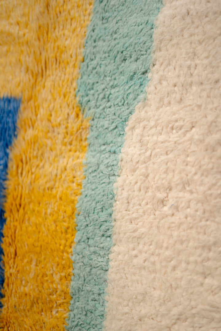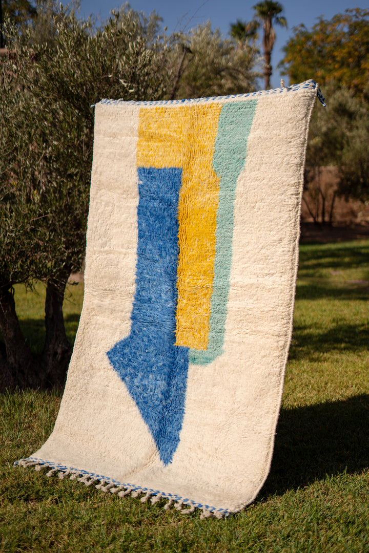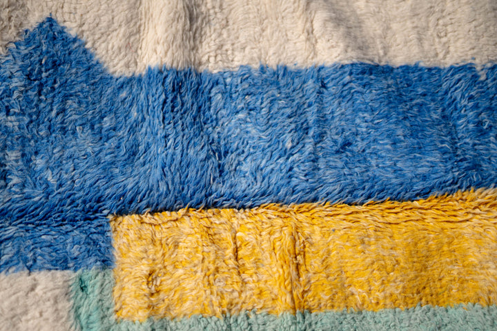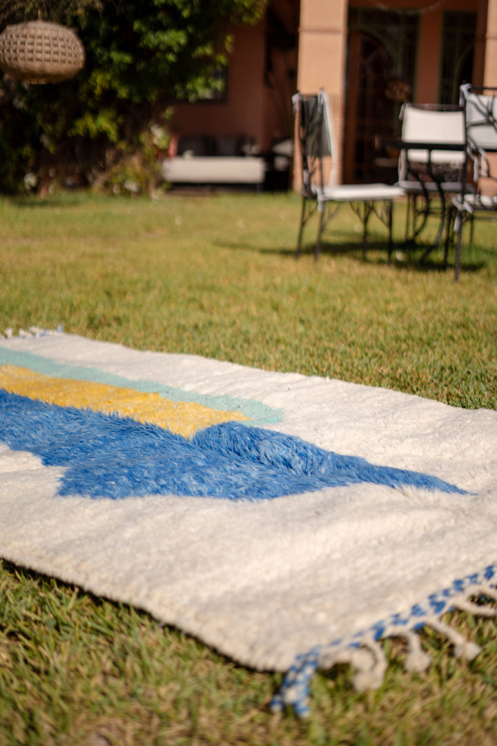 "BLUEY" est un tapis d'exception originaire du cœur de l'Atlas marocain. Tissé à la main en pure laine, il arbore une teinte blanc crème rehaussée de motifs berbères multicolores.