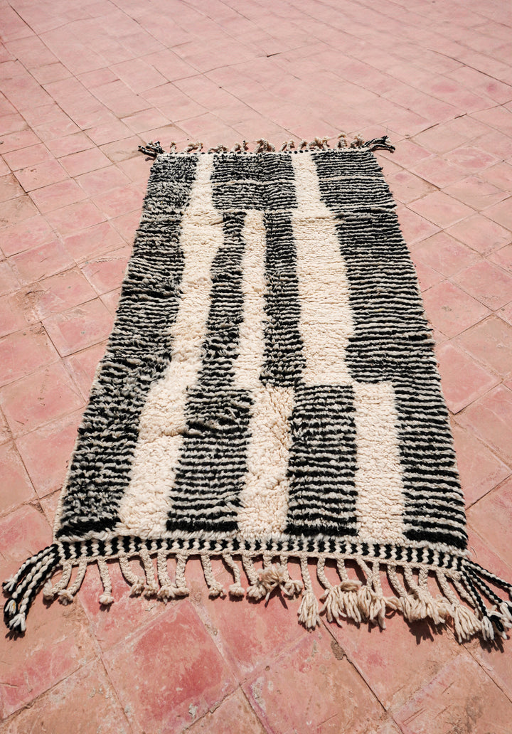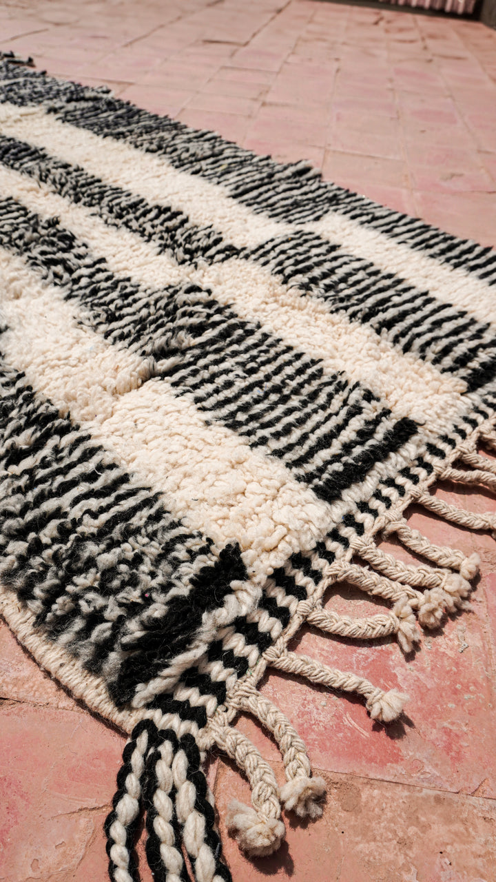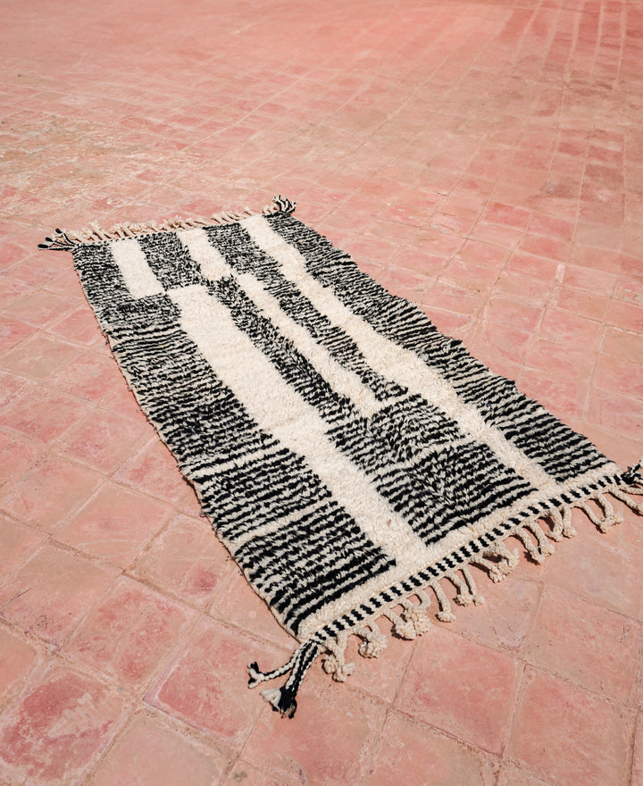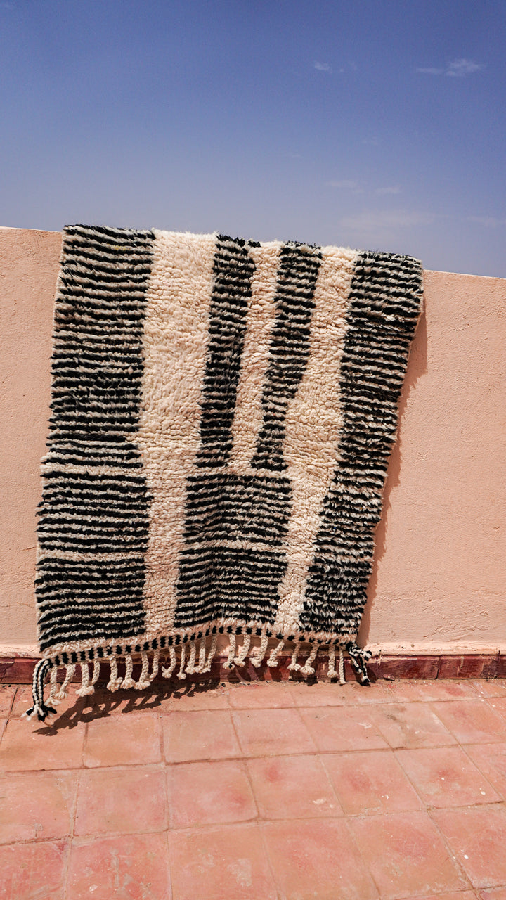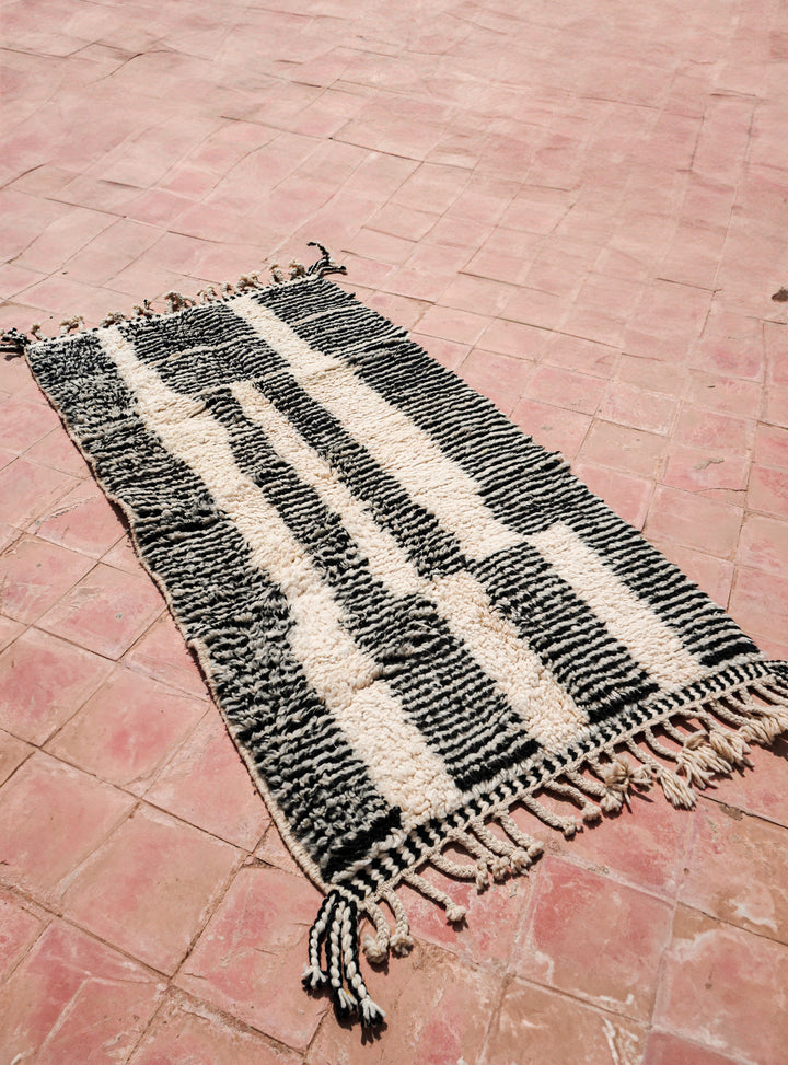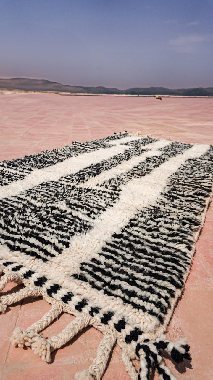 "ZEBRA" est un tapis d'exception originaire du cœur de l'Atlas marocain. Tissé à la main en pure laine, il arbore une teinte blanc crème rehaussée de motifs berbères noir.